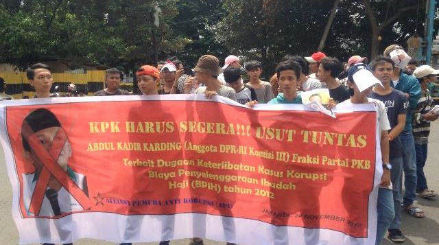 Kali ini pun Aliansi Pemuda Anti Korupsi kembali menggeruduk Komisi Pemberantasan Korupsi atas kasus korupsi dana haji yang melibatkan Abdul Kadir Karding yang diketahui saat ini sebagai Anggota DPR RI Komisi III dari Fraksi PKB.