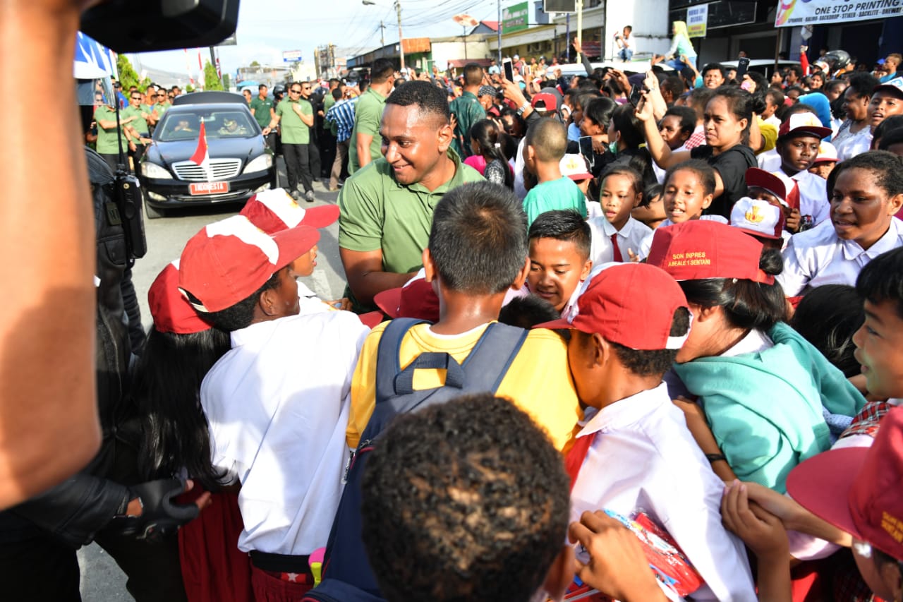 Di sepanjang jalan menuju ke lapangan kantor Bupati Jayapura itu, tampak masyarakat terutama kalangan pelajar antusias menyambut kedatangan Presiden dan Ibu Negara Iriana.