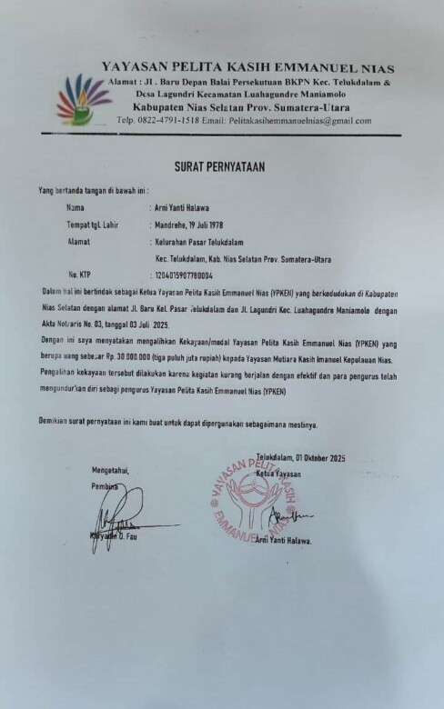 KEP.NIAS || Citranewsindonesia.com — Setelah pengumuman Yayasan Pelita Kasih Emanuel Nias Dinyatakan Oleh ketua Yayasan YPKEN Arni Yanti Halawa Dan Pengurus Yayasan dan pembina Bubar (30/9) maka semua Aset kekayaan Yayasan YPKEN dialihkan kepada Yayasan Mutiara Kasih Imanuel Kepulauan Nias Tertanggal 01 okt 2025 .