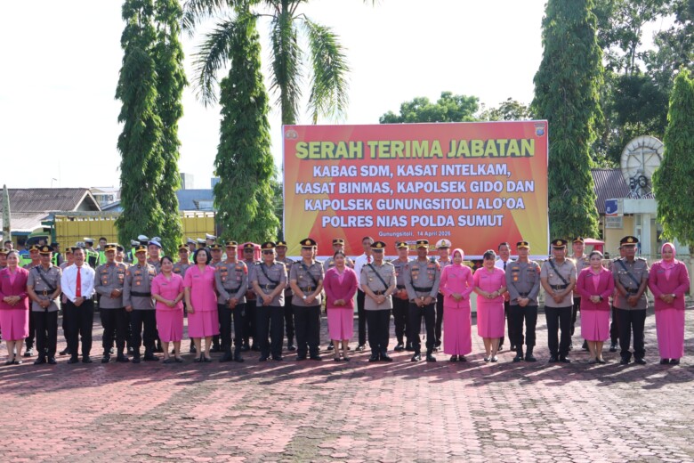 NIAS || citranewsindonesia.com – Polres Nias, Polda Sumatera Utara, menggelar upacara serah terima jabatan (sertijab) untuk sejumlah posisi strategis, mulai dari Kabag SDM, Kasatintelkam, Kasatbinmas hingga dua Kapolsek, Selasa (14/4/2026).